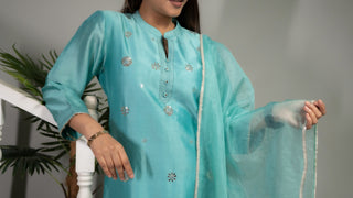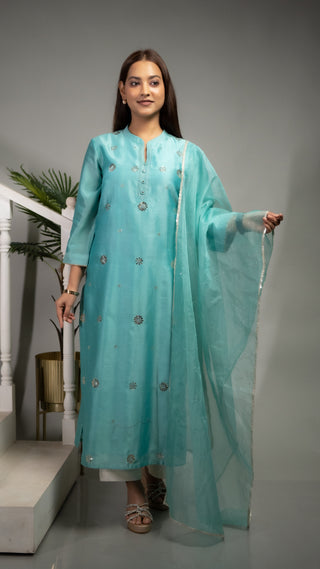 Upgrade your ethnic wardrobe with the Chanderi Silk Mokash Set, a perfect blend of traditional craftsmanship and contemporary elegance. Designed for effortless grace, this set features a beautifully detailed Chanderi Silk kurta adorned with delicate floral prints and playful tassels. Paired with soft Malai cotton pants, it offers a comfortable yet stylish look for any occasion. Whether you're dressing for a festive gathering, cultural event, or a casual day out, this ensemble ensures you look effortlessly refined.
